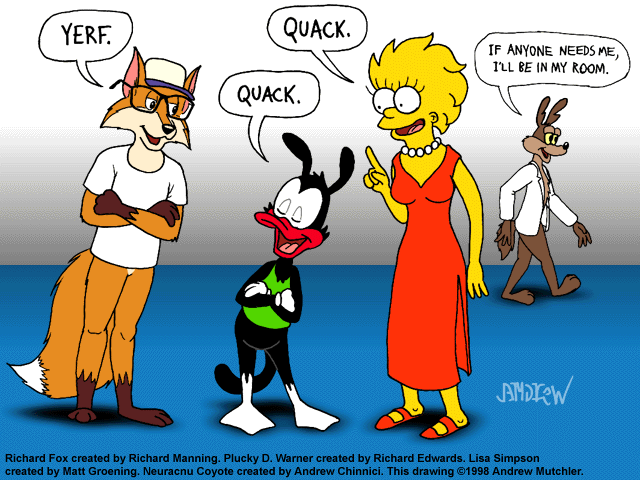 Richard yerfs. Plucky quacks. Lisa borrows Plucky's line. Neu Coyote borrows Lisa's line. Okkay, it's all kind of silly, but hey, it's a cute pic!