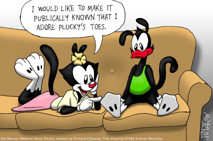 Plucky sits on a couch as Dot plays with his duckytoes. She wants to make it publically known that she adores Plucky's toes!