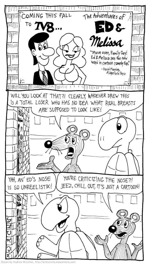 While contemplating a poster for a new cartoon show called "Ed & Melissa", Stanley gets hypocritical in his sanctimoniousness about cartoonishly unrealistic body parts. I wonder, did Tex Avery ever get this kind of guff for "Red Hot Riding Hood"?