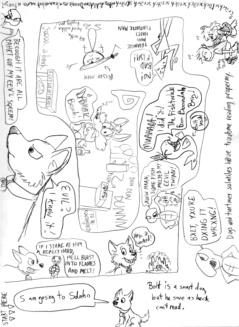 Drawn by me and Babs at Anthrocon. We started drawing stuff about Bolt at bottom left, and it all spiraled inward to the center.
