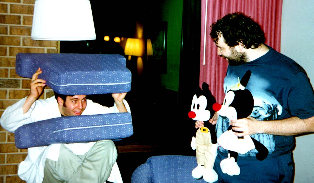 Photo by Neu. Red Dwarf uses seat cushions to do his impression of Gypsy while Yakko and Dot plushies play Crow and Servo to my Joel Robinson.