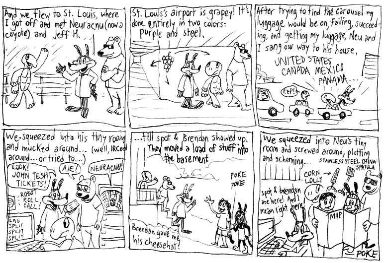Panel 4: Neuracnu showed us a clip of "The Care Bears Movie", which is where his name comes from. There's a scene where a kid is spinning around inside an amusement park spinning-barrel thingy, and with absolutely no explanation, he says "Neuracnu!" It seems to be some magic word to make the barrel stop spinning, perhaps.