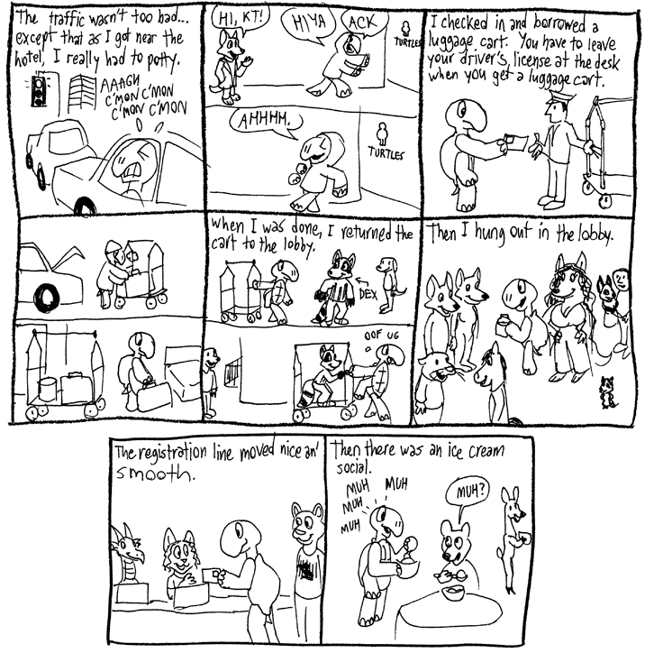 Drove to the hotel, unpacked car. Silly raccoon on cart.