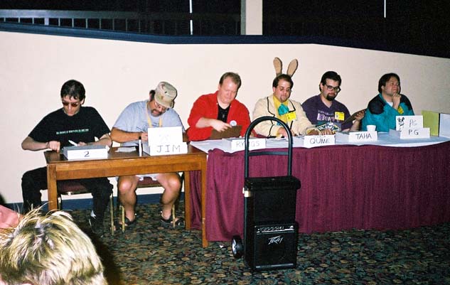 The Match Game furry celebrity panel: 2 the Gryphon, Jim Groat, Guest of Honor Ryngs Raccoon, Qume (in March Hare outfit), Tahamaki, and PandaGuy.