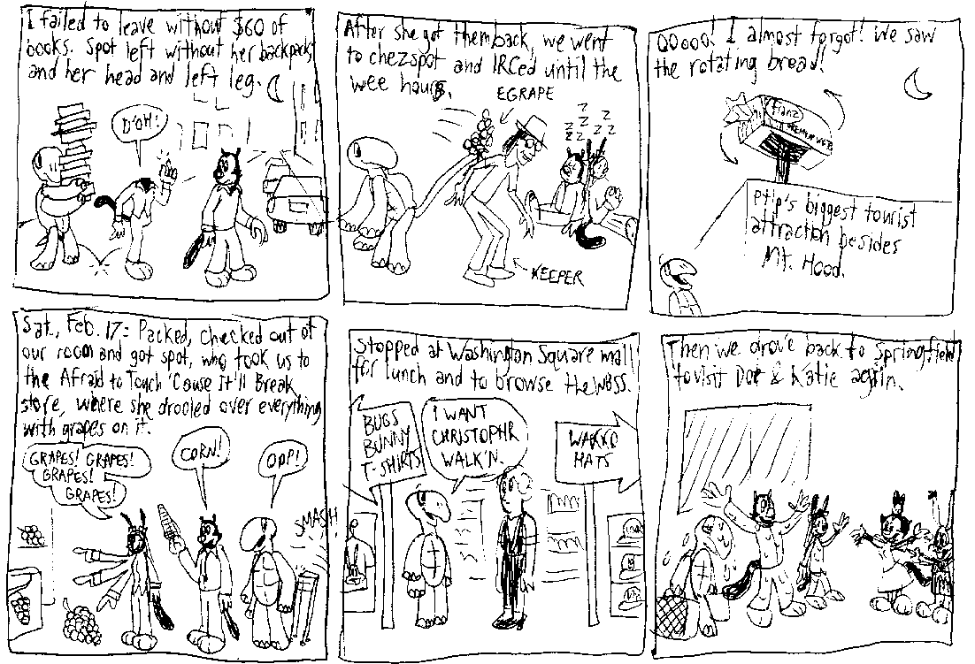 Panel 5: A reference to the Animaniacs cartoon with Christopher Walken in it; the Warners throw a party in the watertower, inviting Mr. Plotz and others, and everyone gets introduced to Christopher Walken, who sits on a couch and says "Hullo!" and creeps everyone out.